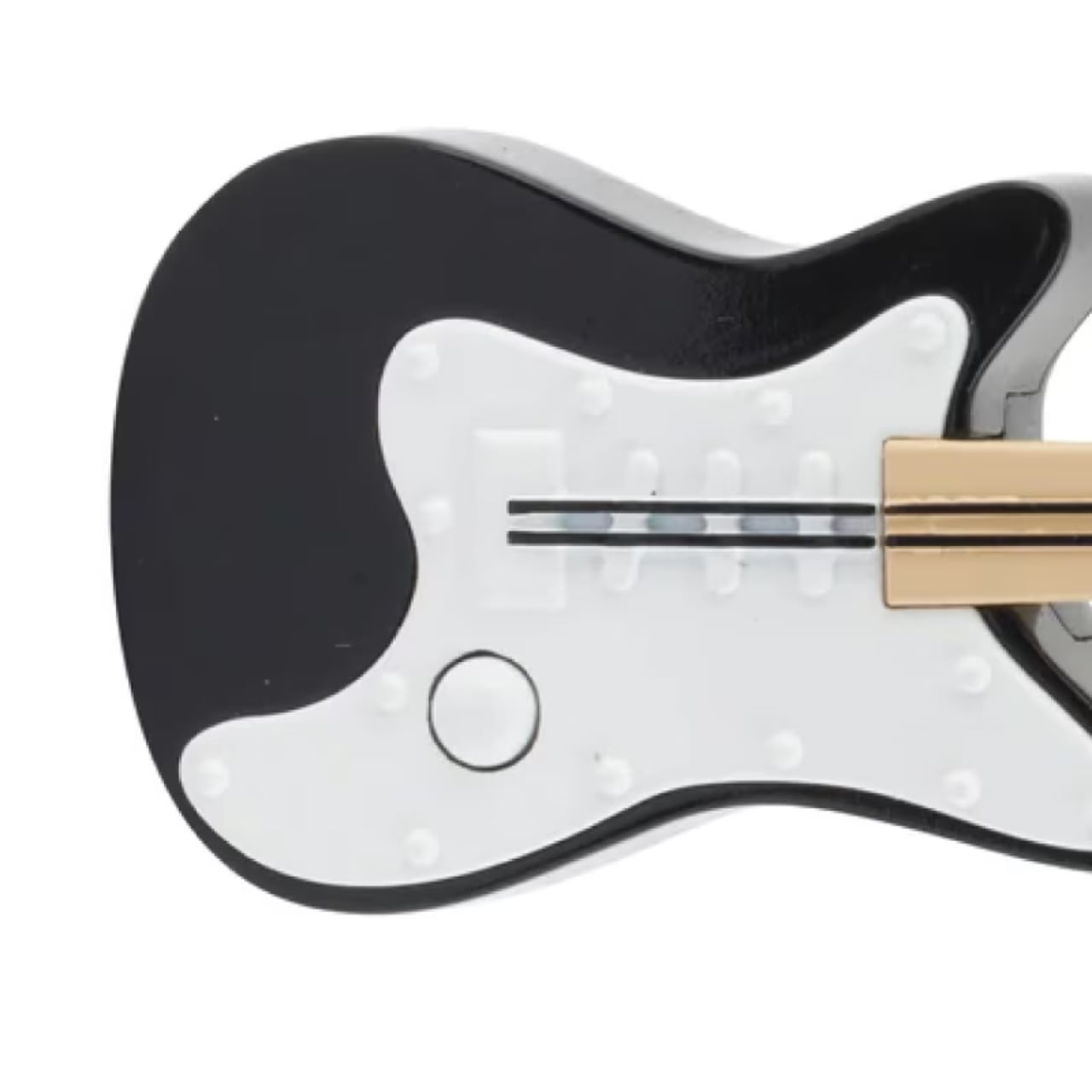 光と音でギタリスト気分を楽しめるキーリング。正面のピックガード部分のボタンを押すと、下部分からカラフルなLEDが弾け、ド派手なロックギターソロが流れ出します。