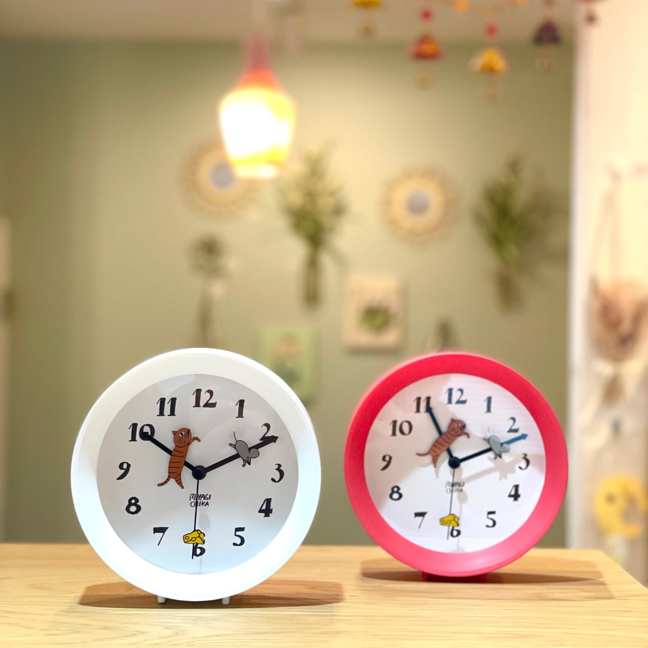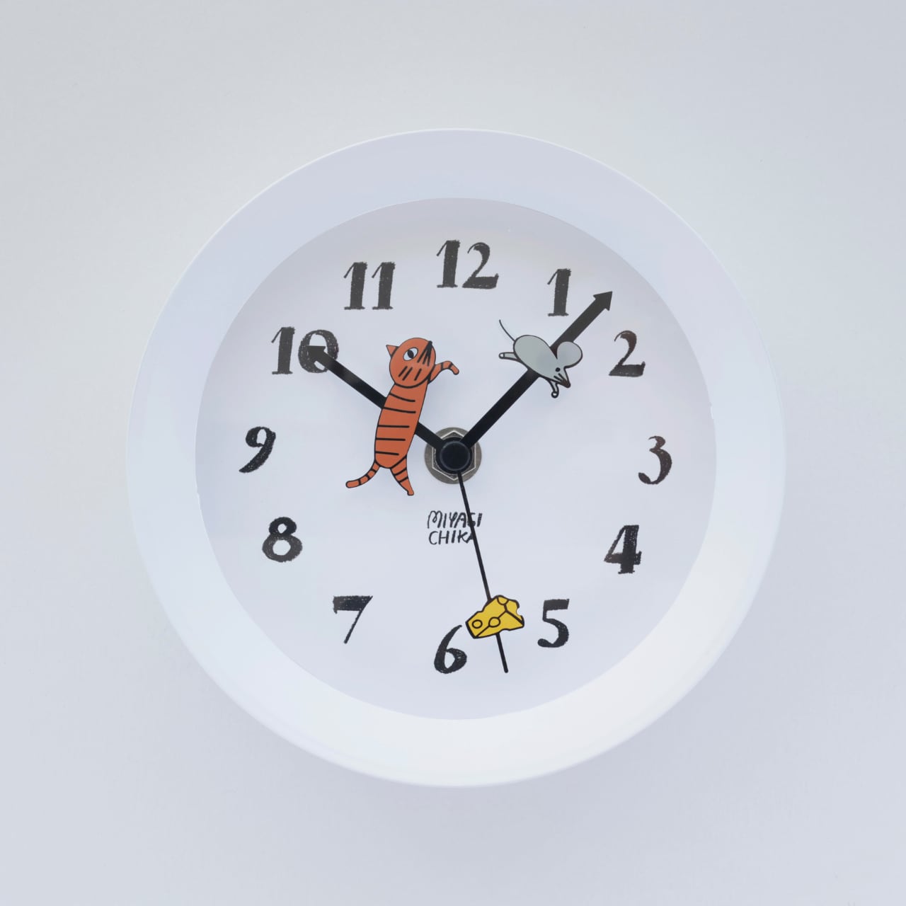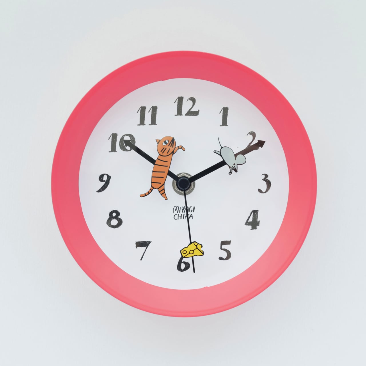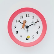 手描きのあたたかみのある数字を文字盤に施し、短針・長針には追いかけっこするように動物がついているキュートな時計。