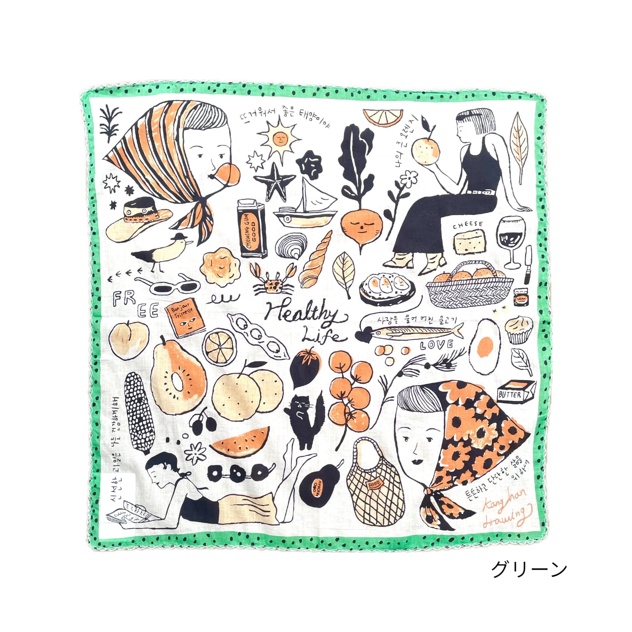 大判タイプなのでハンカチの用途以外にも、お弁当を包んだり、バンダナやスカーフとしてもお使いいただけます。