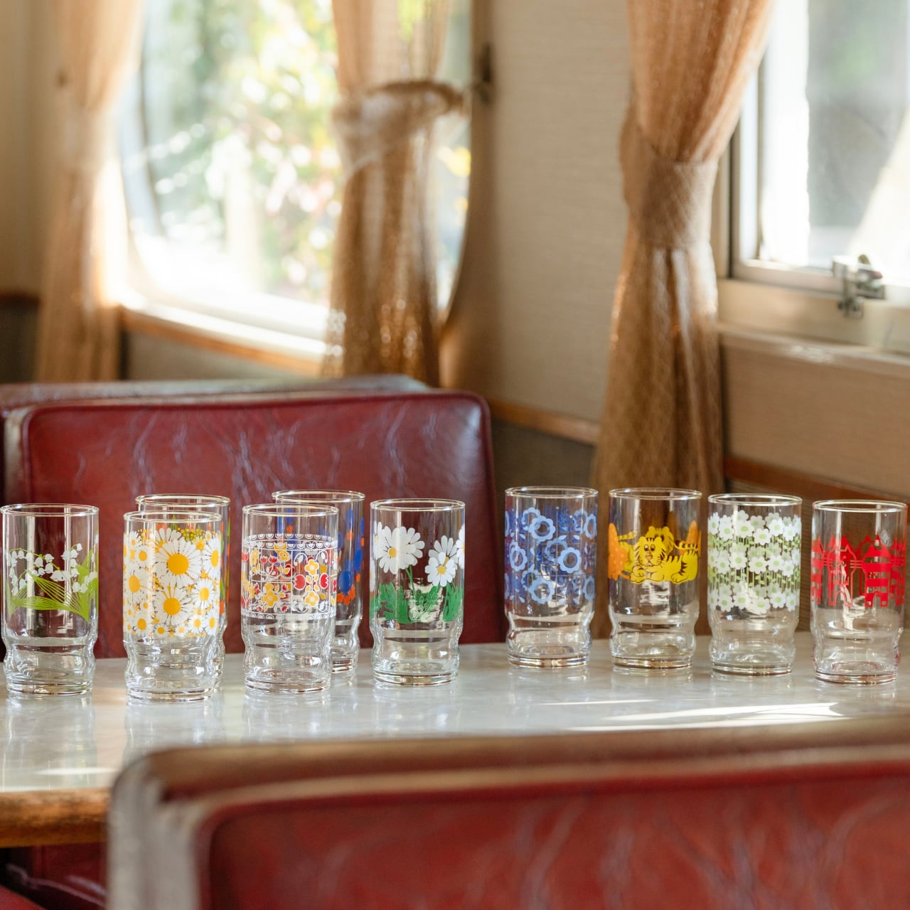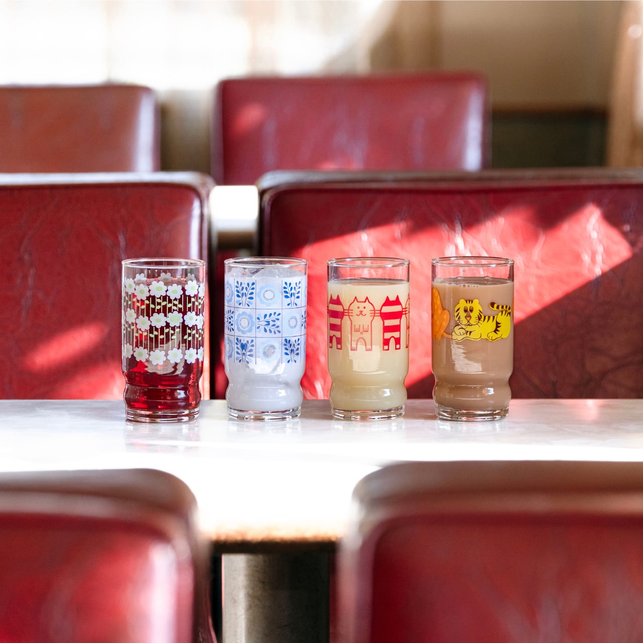 ぷっくりとした膨らみのあるフォルムが特徴の「アデリアアレンジ」は昭和48(1973)年にアデリアが発売したガラス製のコップ(グラス)です。普段使いにちょうど良くかわいらしいコップで、昭和当時は様々なプリントを施して販売されていました。くびれがあるので持ちやすく、どんなドリンクとも相性の良いスタンダードな形状も魅力です。現代でもファンの多いこのコップを、アデリアレトロシリーズとして復刻しました。コップをひっくり返して見ると底にアデリアのaマークが刻印されているのも、昭和当時のデザインが基になっています。